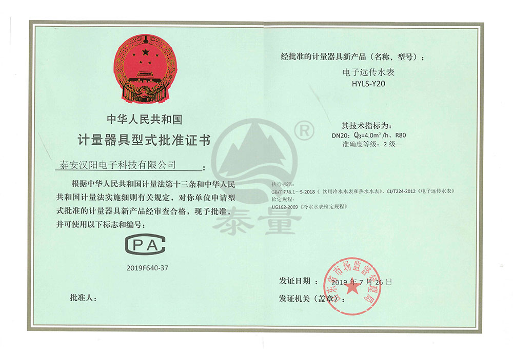 電子遠(yuǎn)傳水表型評(píng)證書(shū)